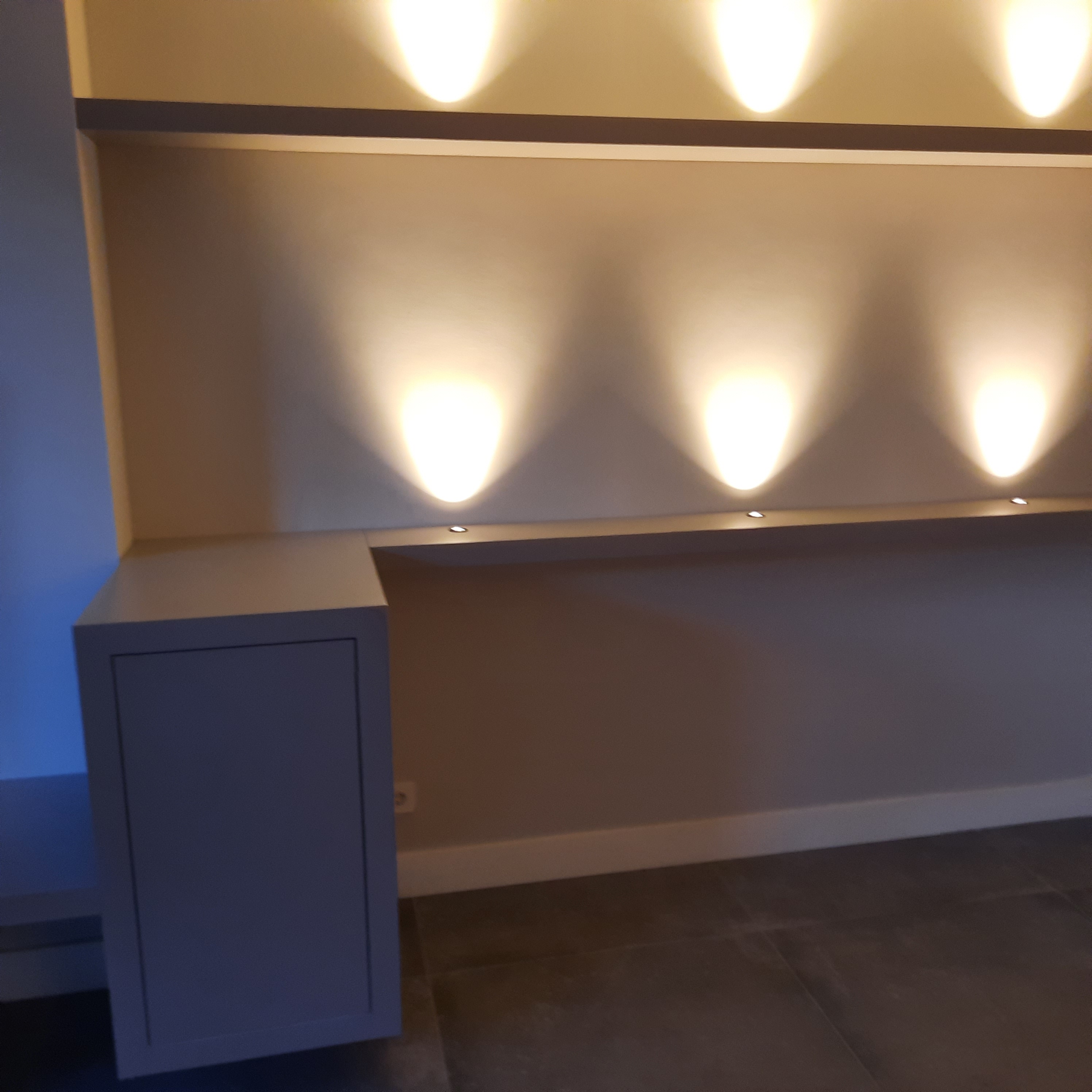 Vooraf hebben we de muren geschilderd in de kleur champignon. Het wandmeubel wat bestaat uit planken, een legkast met een push-to-open deur en een tv meubel, heeft een een donkere tint gekregen. Mede hierdoor en door de verlichting, welke via een mobiele app is te bedienen, heeft de het wandmeubel een mooie uitstraling gekregen. Het is prachtig geworden!